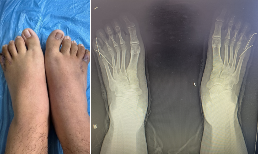 对于每一个孩子来说,拥有一双健康的双脚,能无拘无束地奔跑,是成长中最珍贵的权利。但先天性足趾多趾、并趾畸形,却让不少孩子从小背负身体与心理的双重压力,不仅影响足部外观和穿鞋行走,更可能在成长中埋下自卑的种子。近日,北华大学附属医院手足外科团队成功完成1例双足足趾多趾并趾畸形矫正手术。 患者为青少年,自幼双足存在多趾合并并趾畸形,脚趾数量异常、趾体粘连,不仅外观与常人不同,穿鞋磨脚、行走受力不均,长期还可能影响步态与足部发育。随着年龄增长,孩子逐渐在意他人目光,不愿露出双脚。为了让孩子彻底摆脱困扰,家人多方了解后,专程来到我院寻求专业治疗。 患者入院后进行相关检查,结合影像学资料,清晰判断骨骼、关节、肌腱、神经血管走向,精准分型、精细规划。考虑到患者年轻,对外观与功能要求高,手足外科团队为他制定个体化矫形方案:精准切除多余足趾,精细分离并连趾体,重建趾蹼,修复重建软组织与皮肤,兼顾足部功能与长期发育,尽可能让切口隐蔽、愈合平整、术后不留明显痕迹。 矫形手术是一项精细的“手工活”,需要在麻醉下由经验丰富的医生操作。主要包括两个核心步骤: 1.切除多趾 医生根据X光片和外观,准确判断哪一个是需要切除的“多趾”。保留皮肤和软组织,精准切除多余的骨骼,同时修复足部的韧带和肌腱,确保保留的脚趾稳定、有力,排列整齐。 2.分离并趾 医生在并趾之间设计皮瓣,重建趾蹼,而不是直切口。这样可以避免术后疤痕直线挛缩,导致脚趾再次并在一起。如果并趾分得太开,中间皮肤不够,就需要从腹股沟取一小块薄薄的皮肤进行植皮,以保证伤口完美愈合。 手术当日,医院第一梯队红医名家、手足外科主任赵维彦带科室主治医师孙汝鑫在麻醉科与护理团队的密切配合下,顺利完成手术。赵维彦团队以极高的精细度完成矫形与修复,最大限度保留正常组织,确保患者术后行走、运动功能不受影响。 术后,男孩恢复良好,已经可以正常穿鞋、正常走路、自由活动,再也不用刻意隐藏双脚。困扰多年的烦恼彻底解决,孩子脸上重新露出轻松、自信的笑容,勇敢追求自己的梦想。一双脚的改变,真的可以照亮一整个青春。 手足外科主任赵维彦特别提醒:多趾、并趾是儿童/青少年常见先天性足部畸形,越早接受规范治疗,效果越好、恢复越快、外形越自然。早期干预不仅能改善功能、避免受力异常,更能保护孩子心理健康,让孩子在成长中自信、阳光、不留阴影。 本文通讯员 手足外科 王琦 本文专家 供稿丨手足外科 编辑丨吴志成 初审丨赵维彦 复审丨尹莉 终审丨王华
